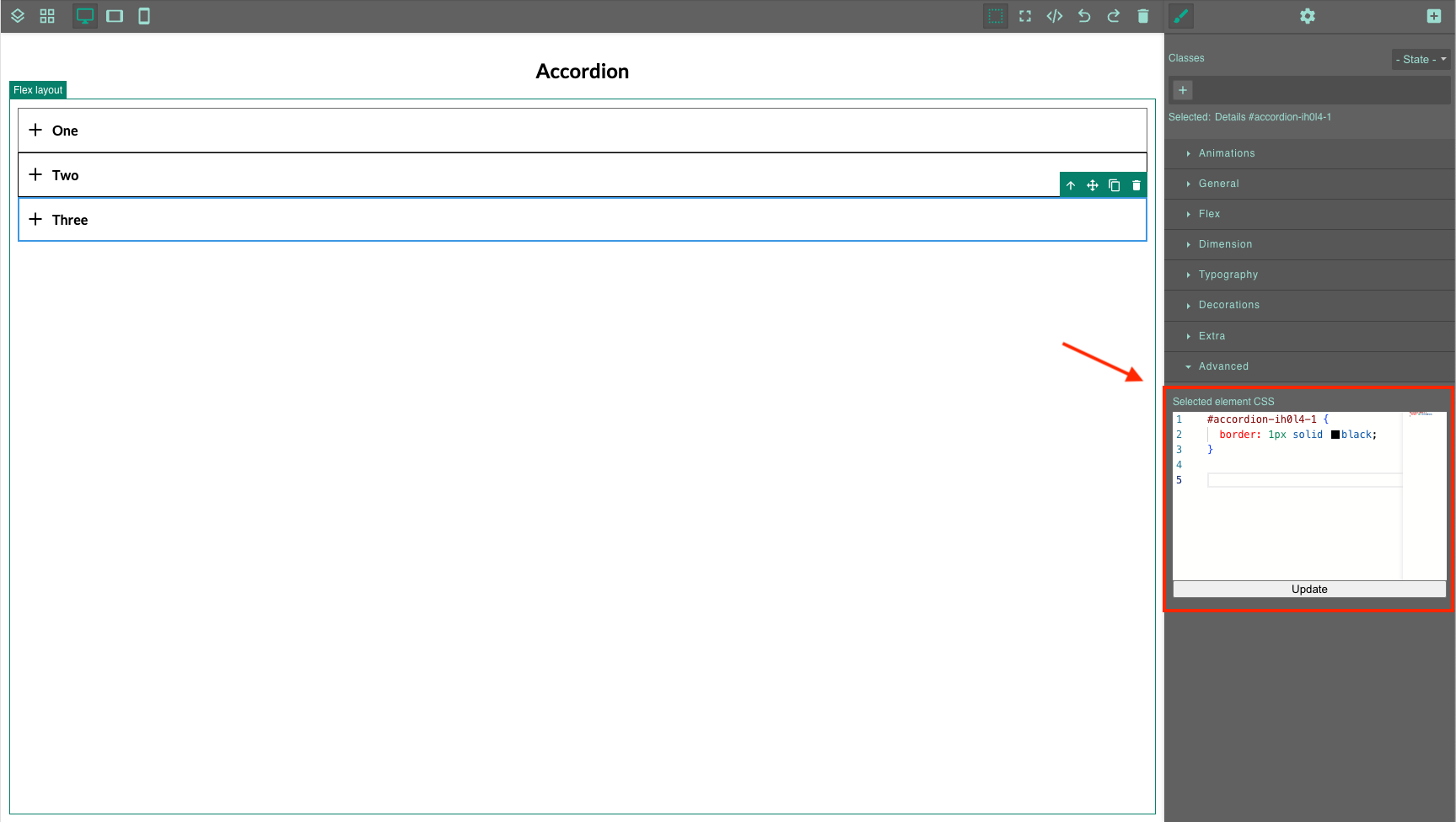 Du findest diese Option in den Design-Einstellungen (das Pinsel-Icon im rechten Bereich der Toolbar) des ausgewählten Bausteins. Innerhalb des Code-Editors kannst du sowohl CSS-Regeln für das ausgewählte Element via id festlegen, als auch Regeln für CSS-Klassen und so beispielsweise das Aussehen für eine bestimmte Art von Baustein festlegen.