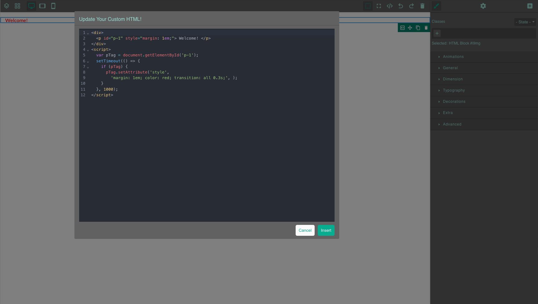 Hier kannst du nun nach Belieben deinen eigenen HTML-Code, Inline-CSS-Styles sowie innerhalb eines script-Tags dein eigenes JavaScript einfügen. Der Scope für den JavaScript-Code ist dabei der HTML-Baustein selbst.